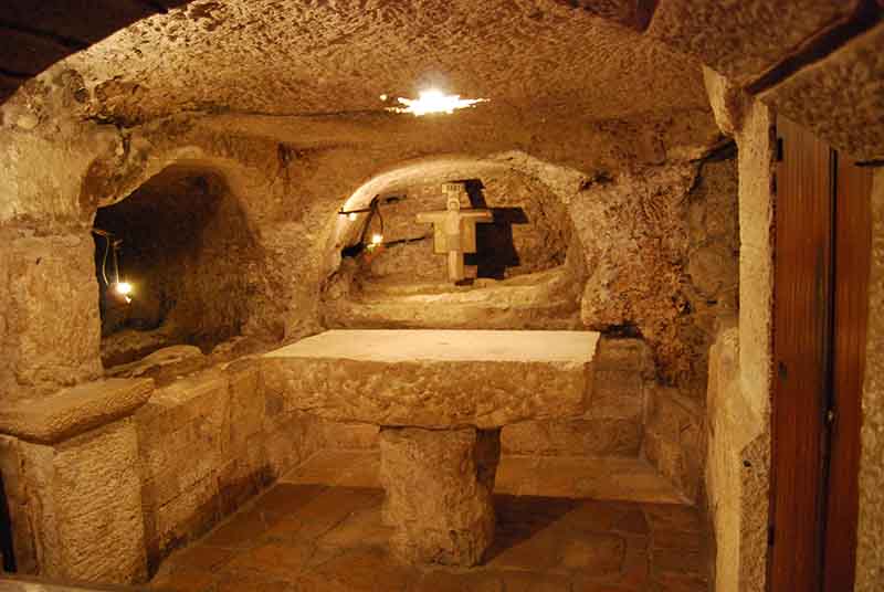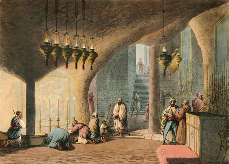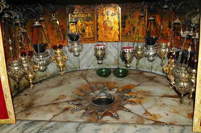 Below a 14-point silver star in the floor is the Grotto of the Nativity, a rock cave thought to be the original location of Jesus’ birth. Today, much of the cave is lined with polished marble, as pilgrims have visited this location for over 1700 years.